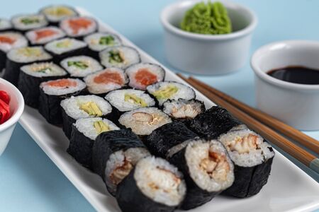 Sushi with fish, with cucumber, with eel, with avocado. Wrapped in Nori Seaweed. Food for vegetarians. Soy sauce, ginger, wasabi in white bowls. Copy space.