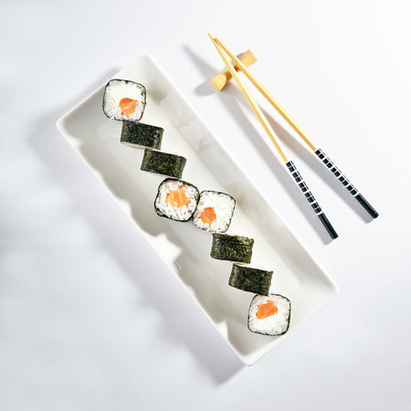 Philadelphia Sushi Roll made with Smoked Salmon. Maki sushi with nori seaweed outside, salmon and cream cheese inside. White plate with wooden chopsticks on white table. Top view