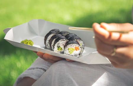 A young woman eating sushi in nature, maki roll close-up.