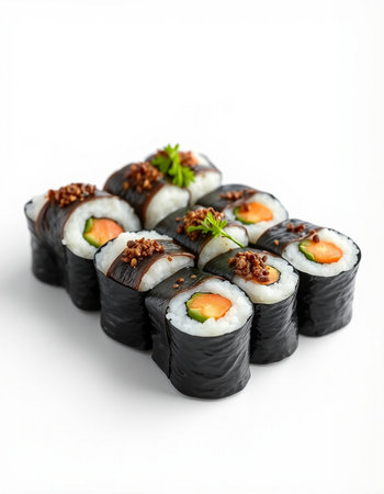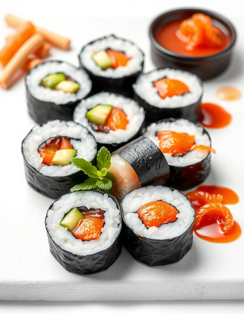 Sushi rolls with mixed ingredients on a white background