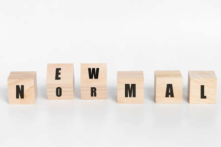 Close-up New Normal, words on wooden alphabet cube on shelf on white background. New normal after covid-19 pandemic concept.