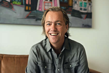 Smiling man with blue eyes and curly hair poses in a cozy room setting.
