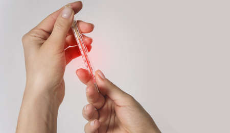 Woman hands holding mercury thermometer on white background. Fever and healthcare concept. Top view