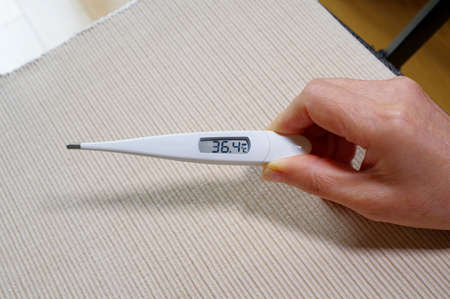 Thermometer in a female hand on a white wooden table. Temperature measurement with a thermometer.