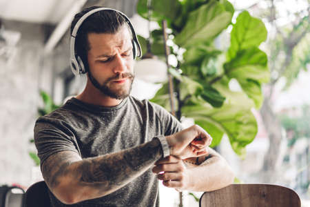 Athlete focused on running training for marathon, preparing for morning run, motivational music in headphones, athletic man turns on watch app monitoring heart rate, route.