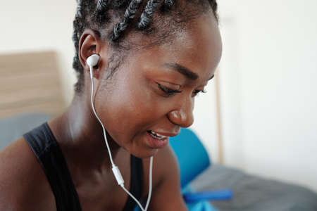 Close-up image of young Black woman sweaty after training at home choosing next song on smartphone or player