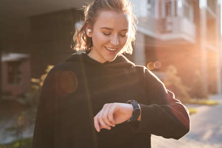 Young smilling fit woman checking smart watch while sitting on stairs