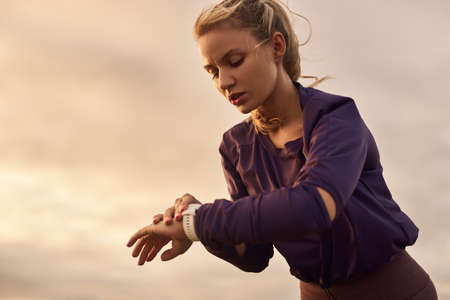 Sportswoman checking pulse on wristwatch