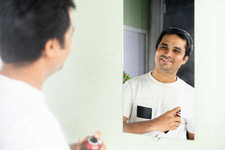 happy Handsome young man getting ready applying or using perfume by looking camera - concept of freshness, mood enhancer, fashion and skin care.