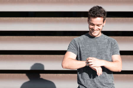 Handsome man looking at his sports watch before he starts running. Modern background in outdoor location.