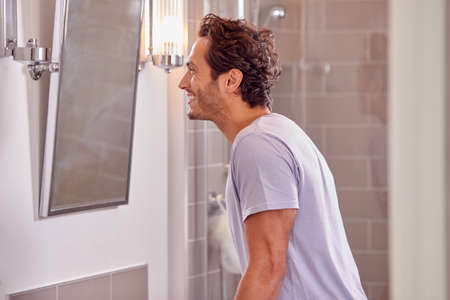 Man Wearing Pyjamas In Bathroom At Home Looking In Mirror