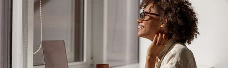 Beautiful cheerful European woman sitting in front of her computer, stretching and relaxing. Leisure time activity concept. . High quality photo