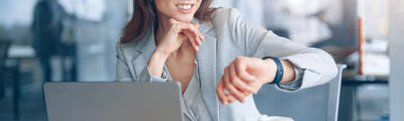 Positive businesswoman wearing eyeglasses looks at her wristwatch at modern office