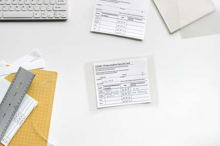 Fake covid vaccination record card. Covid scams. Forged health certificate with false vaccination record against covid. Blank card, pen, paper knife,laminator. Top view, flat lay on white.