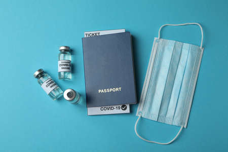 Vials with COVID - 19 vaccine, medical mask and passport on blue background
