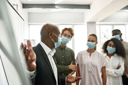 Reopening business. Rear view of a young man in protective face mask sticking open sign with text OPEN AS NEW NORMAL on the glass door in the office