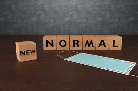 Top view chalkboard with texts on wooden table. Disposable face masks visible. Conceptual of new normal as lifestyle. Selective focus.