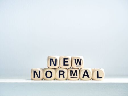 Close-up New Normal, words on wooden alphabet cube on shelf on white background. New normal after covid-19 pandemic concept.