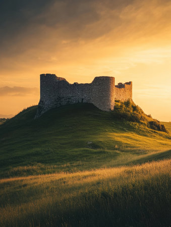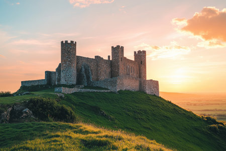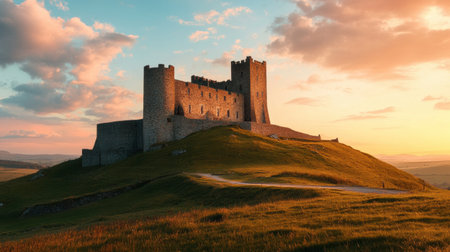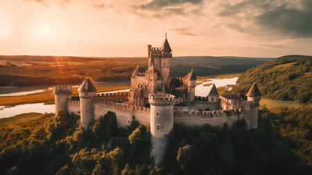 A stunning medieval castle stands on a lush green hill, bathed in warm, golden hues from the setting sun and surrounded by rolling landscapes.