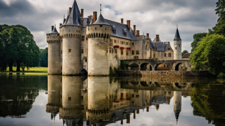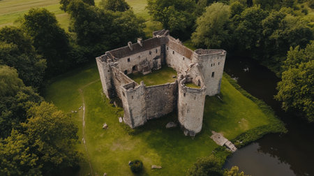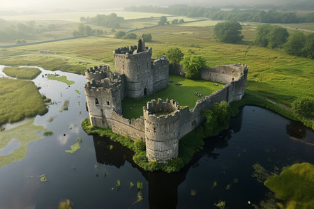 This aerial photograph captures the stunning view of a castle situated in the middle of a river, A medieval castle surrounded by moat from an aerial perspective, AI Generated