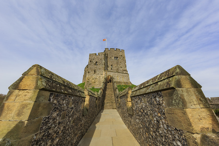 Hever Castle, England - April 2017 : Flag on the top of the tower in Hever Castle built in the 13th century, historical home of Ann Boleyn, the second queen consort of King Henry VIII of England