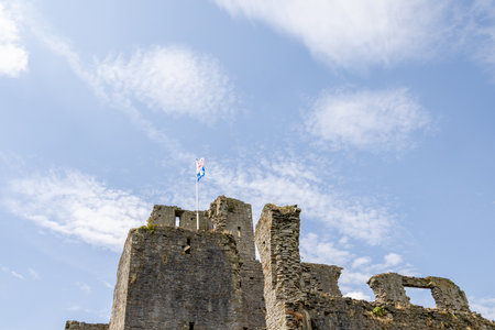 Looking up at the red dragon the Welsh flag seen above Beaumaris Castle in Wales during October 2021.