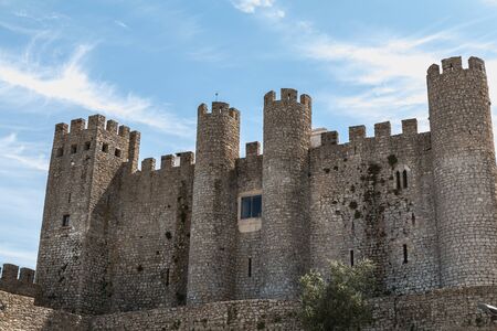 Obidos, Portugal - April 12, 2019: architectural detail of the medieval castle of Obidos on a spring day