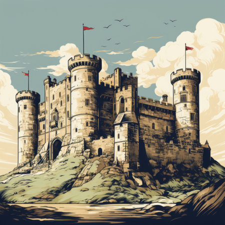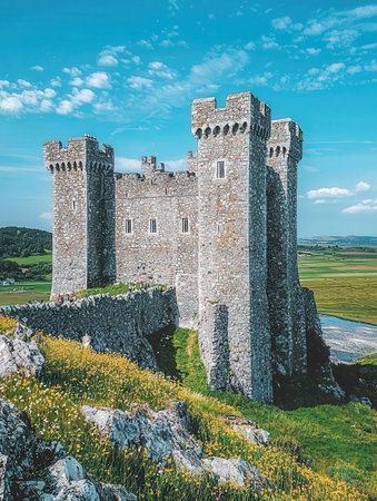 This image features a majestic medieval castle atop a scenic hillside, flanked by robust stone walls and surrounded by lush greenery, beneath a bright blue sky interspersed with clouds. AI generated image