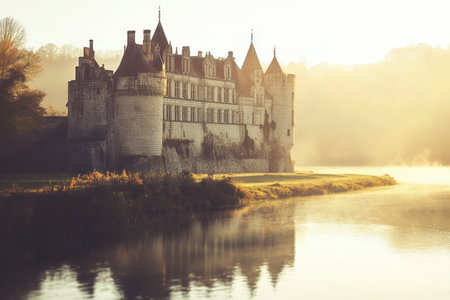 A stunning castle overlooks a calm river, surrounded by mist and the soft glow of early morning light.
