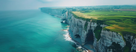 Dramatic Chalk Cliffs with Natural Arches and Verdant Fields from Above