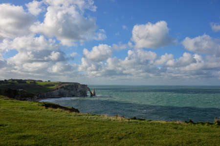 coastal landscape along the Falaise d'Aval the famous white cliffs of Etretat village with the Porte d'Aval natural arch and the rock known as the Aiguille d'Etretat