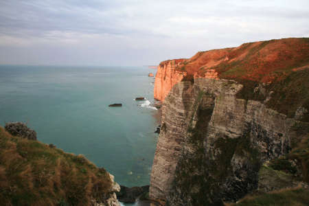 Rocky french coastline in Normandy. North sea at sunset