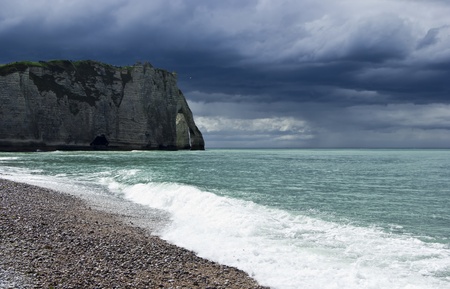 The beach and cliffs of Etretat with a gloomy sky, tourist site of a Norman French town