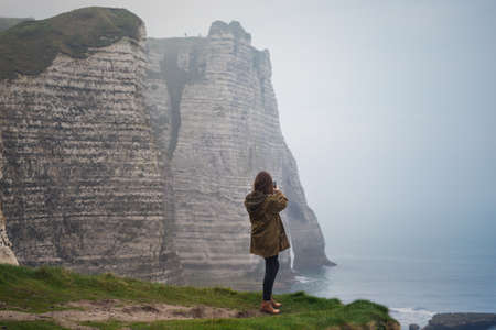 girl standing at the edge of rock in the Etretat. France