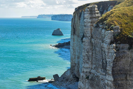 Scenic landscape of Etretat cliffs, iconic landmark of Normandy Coast, Falaise d'Amont, on late afternoon, France