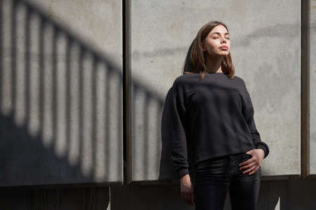 Woman wearing black sweatshirt or hoodie for mock up, logo designs or design prints with with free space on the city streets.