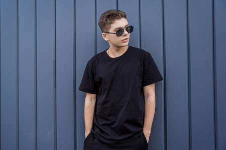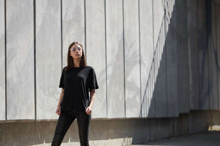 Woman or girl wearing black blank cotton t-shirt with space for your logo, mock up or design in casual urban style