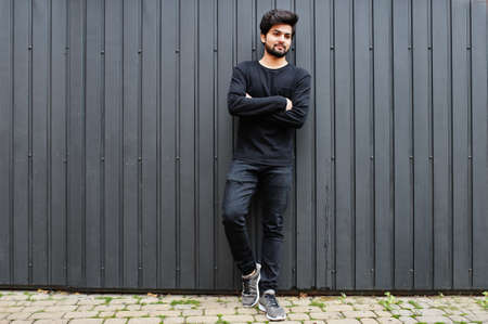 Urban young hipster indian man wear all in black. Cool south asian guy.