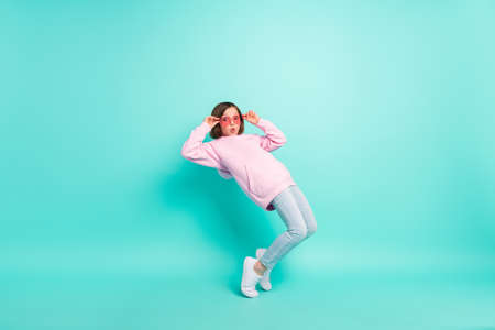 Profile full size photo of brunette hairdo funny small girl dance wear pink eyewear sportswear isolated on teal color background