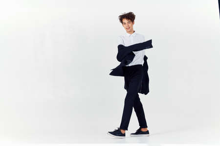 handsome young man in classic suit with jacket in hand on light background cropped view