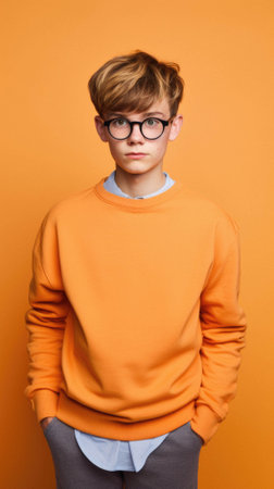 Photo of handsome boy dressed orange sweater isolated over orange background.