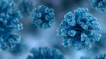 Microscopic view of blue virus particles with detailed textures, 3d rendering.