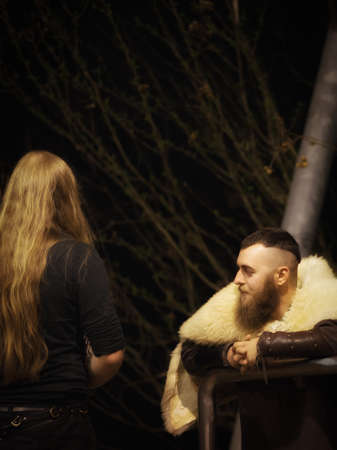 Handsome Warrior Viking man with beautiful medieval woman standing outdoor