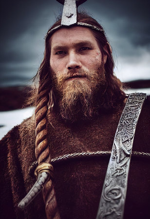 Nordic strong warrior with braided hair and beard, wearing traditional clothes, posing in a historical reenactment