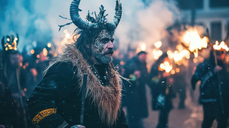 Crowds gather in a winter setting for a lively celebration featuring people in elaborate costumes and fire torches celebrating the Christmas spirit.