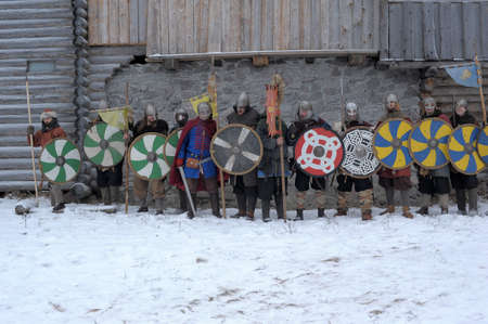 Russia, Saint-Petersburg. 26,01,2014 The festival is a historical reconstruction of the Viking Age in winter. Vikings attack with shields and helmets