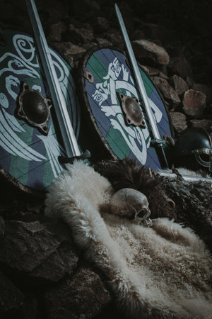 Viking shields and swords over rocky river shore