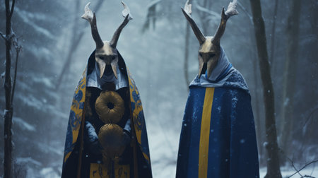two deer, adorned in medieval-inspired costumes, stand gracefully against a wintery forest backdrop. the dark blue and gold attire showcases intricate details, while the monochromatic minimalist portraits capture the essence of cinematic stills. the sculptural costumes, in shades of dark teal and yellow, add a touch of elegance to this enchanting scene. ai generated