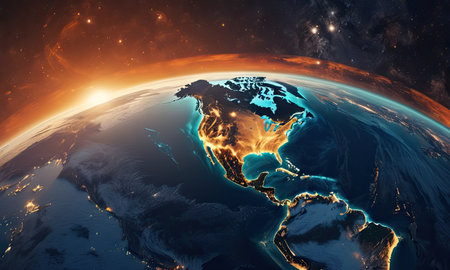 A close up of the earth with the United States lit up in orange. Concept of awe and wonder at the beauty of our planet and the vastness of the universe
