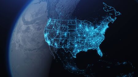 America at night viewed from space with city lights showing activity in United States. 3d render of planet Earth. Elements from NASA. Technology, global communication, world. USA